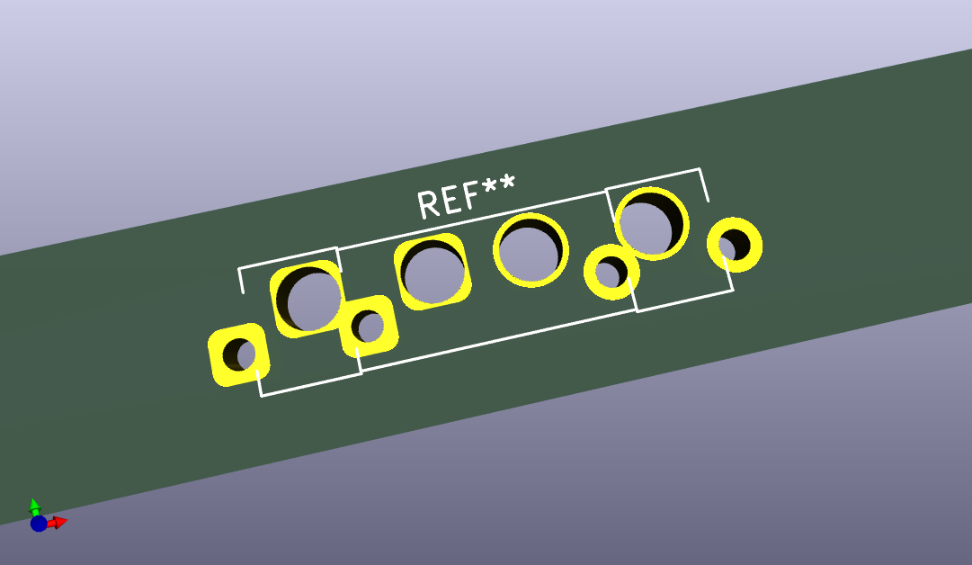 You might notice there’s a small offset between the two footprints. Initially, they were both in line with each other. Checking the final design against the manufacturing capabilities of the PCB manufacturer, it turns out some holes were too close together for their specifications. After some though, I just moved them apart on the vertical axis, just enough to have enough clearance to be back in their specs. When the part is mounted, you hardly notice the offset.