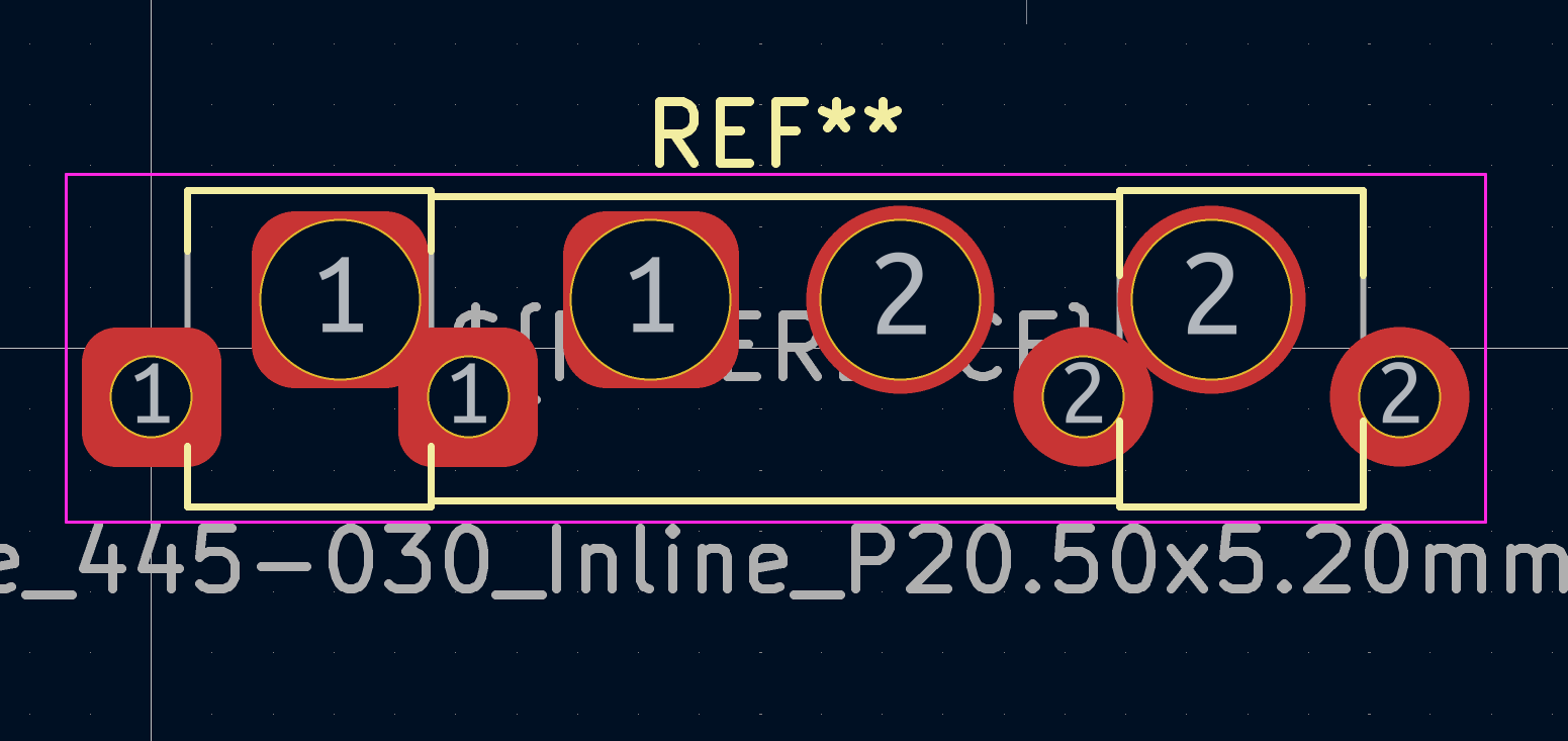 The footprint is essentially a merger of the two original footprints. As we have only two pins on each fuse, this is a very simple example, but it felt like a good start to get started on the concept.